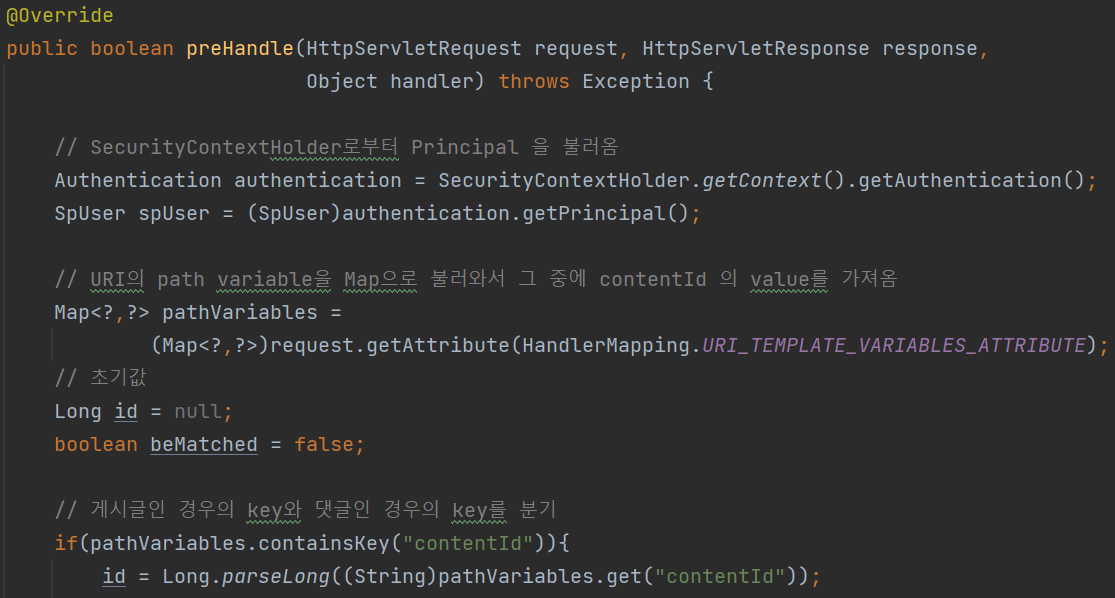 HandlerInterceptor를 implement한 class를 만들어주고 preHandle method를 override 한다. 글자 그대로 특정 동작에 앞서서(pre-) 동작하는 method라고 생각하면 되겠다. 전달받는 path variable에 맞는 DB로부터의 게시글, 댓글 data의 작성자와 비교하여 일치하지 않는 경우 ban page로 redirect 시키고 false를 return시키고, 일치하는 경우는 그대로 true를 return 하여 원래 요청에 맞는 동작이 수행되도록 하는 내용을 작성했다.