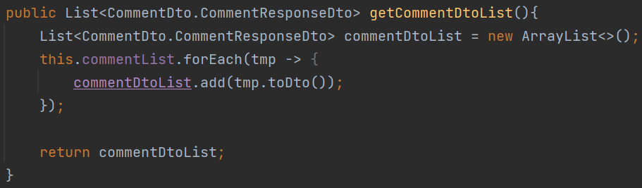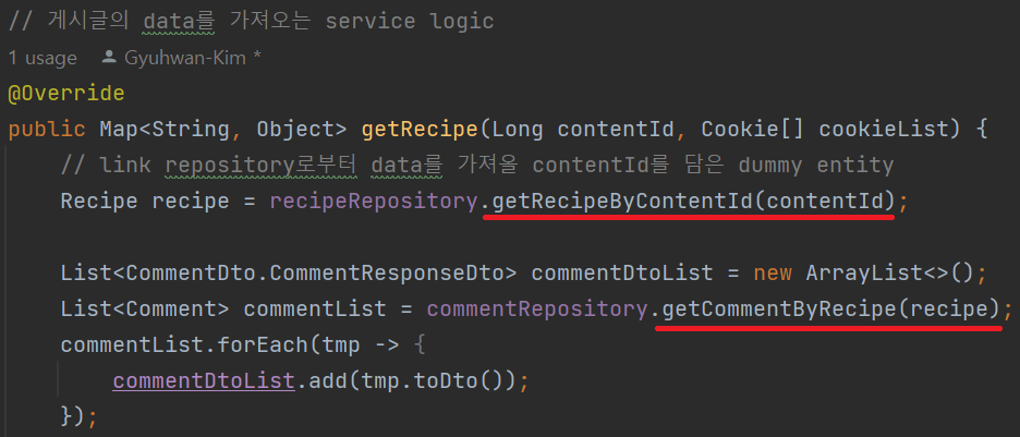 현재의 구조는 우선 recipe table에서 게시글 data를 Recipe Entity로 받고, Recipe Entity에서 다시 댓글 data인 Comment List를 조회하여 각각을 client로 전달하는 DTO로 변환한다. 따라서 시작점인 Comment List를 조회하는 부분부터 수정해주어야 한다.