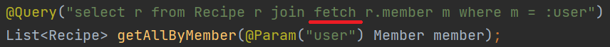 마지막 세 번째는 두 번째 경우에서 where 절에 전달하는 parameter 부분만이 다르다. 지정한 Member 인 경우만 Recipe Entity data를 select 하겠다는 것이다.