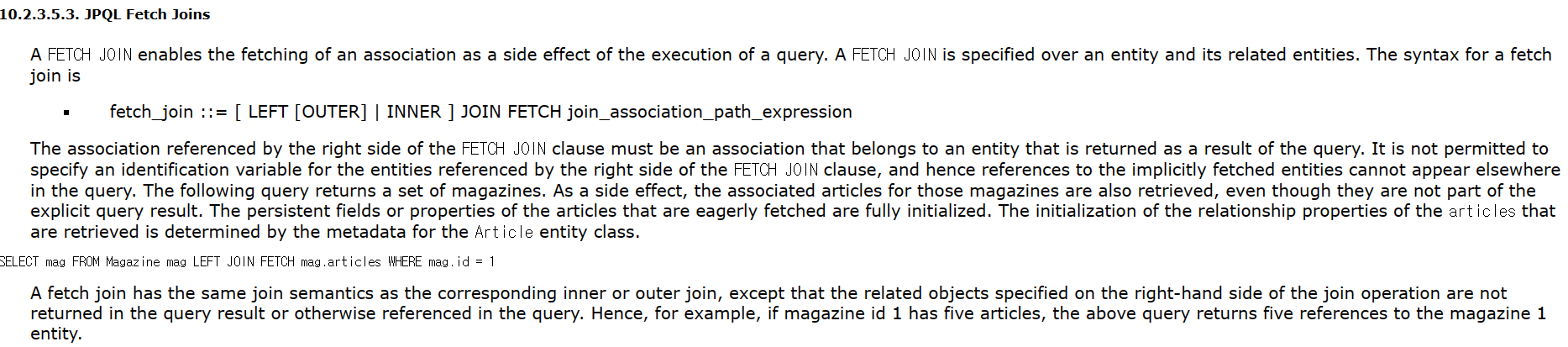 Fetch join은 join operator의 오른쪽 부분에 명시된 관련된 객체들이 query result에 return 되지 않거나 query에 참조되지 않는다는 점을 제외하면, inner 와 outer join에 상응하는 동일한 join의 의미를 가진다. 그래서 예를 들면 id가 1인 magazine이 5개의 article을 가지고 있는 경우에는 위 query가 magazine 1 entity에 대한 5개의 reference(= article) 를 return 한다.