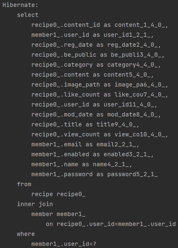 첫 번째는 nativeQuery 속성을 true로 하여 기존에 알고 있던 SQL 그대로를 작성한 것이다. 정리해보면 recipe table의 data 와 그중에 recipe table의 user_id 와 member table의 user_id 가 같은 member table을 join 하는데, 또 그 중에서 recipe table의 user_id가 지정한 parameter에 해당하는 것만 select 하겠다는 것이다.
