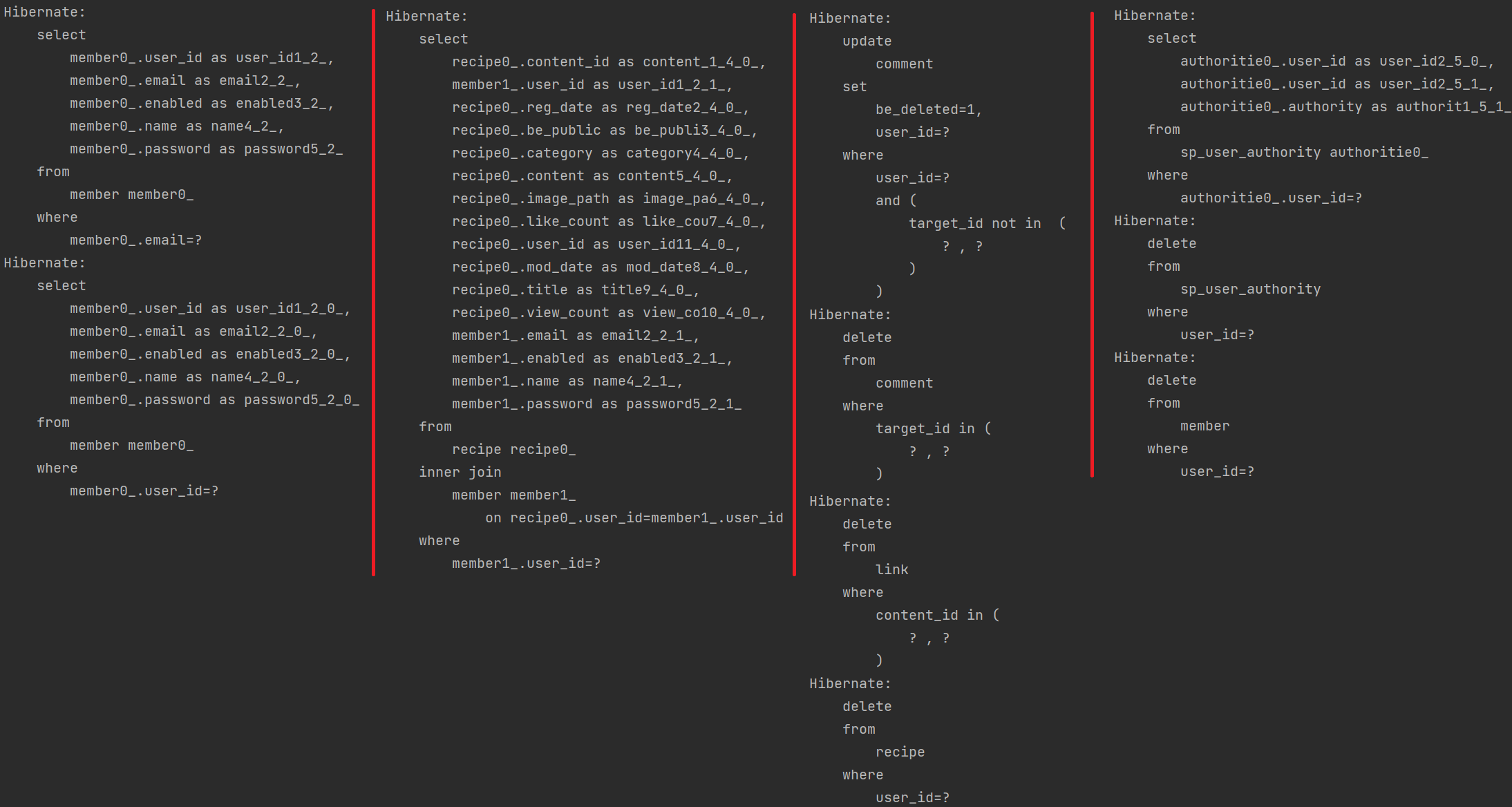 그래서 수행되는 query문이다. 다음과 같이 총 10개의 query가 동작하면서 사용자와 관련된 댓글, 게시글의 참조 링크, 게시글, 권한, 사용자의 5개 항목에 대한 삭제가 이루어진다. 마지막 사용자에 대한 항목은 select query가 수행되는 점을 비교하는 차원에서 남겨두었다.