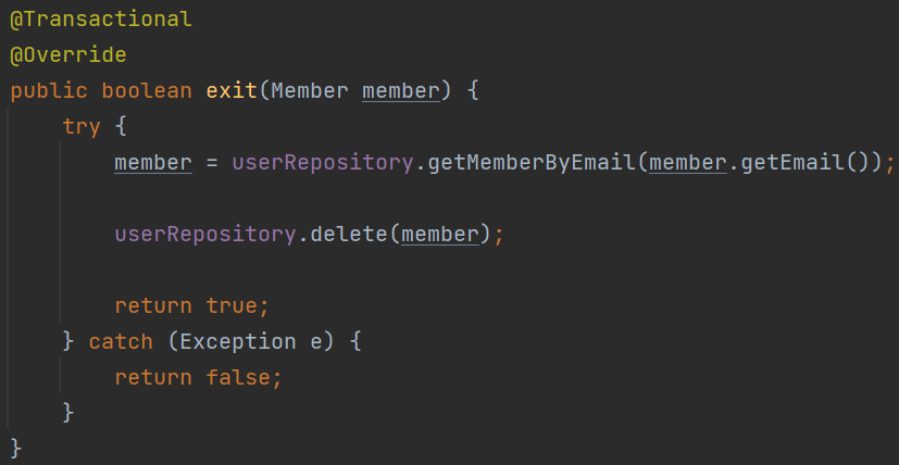 boolean beDeleted = userService.exit(member);