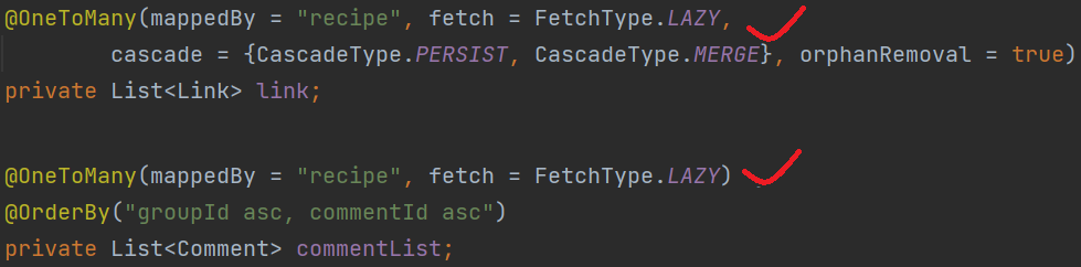 위 이미지는 왼쪽부터 각각 Member 와 Recipe Entity의 연관 관계에 해당하는 field를 가져온 것인데, 표기된 위치에 원래 있었던 cascade 옵션을 없애주었다. 이미 Member Entity의 commentList의 경우는 지난 게시글에서 없앴으나, 이번에 recipeList에서도 없애주었다. 기존에는 연관 관계에 있는 항목에 대한 삭제 query를 자동으로 수행하도록 하는 옵션이었으나, 지금 작업에서와 같이 직접 delete query가 수행되도록 한 경우에는 cascade type REMOVE 옵션에 대한 필요성이 없어진다.