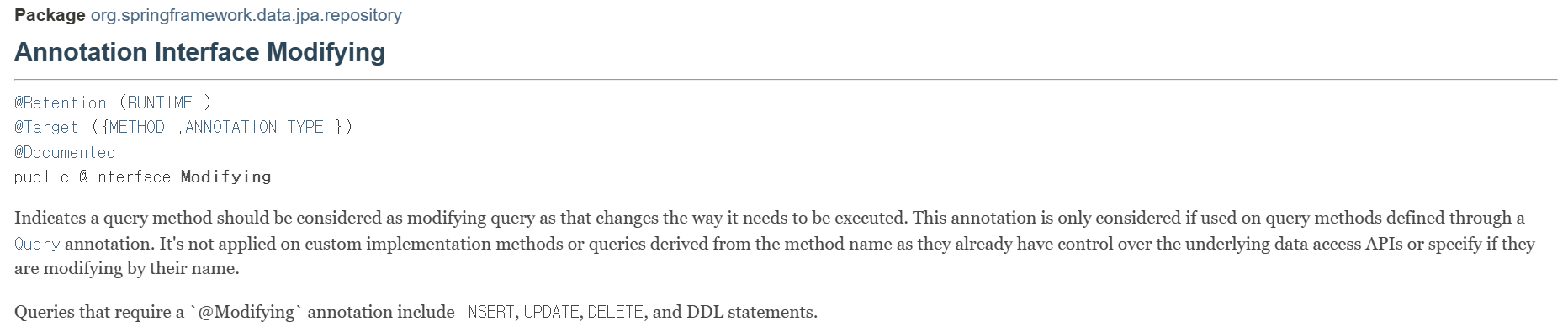 수행되는 데에 필요한 방법을 변경하기 때문에 query method가 modifying query로 고려되어야 한다는 것을 가리킨다. 이 annotation은 Query annotation을 통해 정의된 query method에 사용될 때만 고려된다. 이미 근원적인 data access API에 대한 제어력을 가지고 있거나 이름으로 수정한다면 그것을 이미 명시하고 있기 때문에 method 이름으로부터 도출된 custom implementation method나 query 에는 적용되지 않는다.