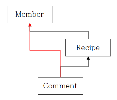 필자의 경우 Member(사용자)와 Recipe(게시글), Comment(댓글) Entity 에 대해 위 이미지와 같이 이상한 연관 관계를 형성해 준 상태이다. 사실 이상하다는 점을 그림을 그리고서 깨달았다. 게시글이 댓글 정보를 가져야하는 것도 맞고, 사용자가 작성한 게시글의 목록을 가지고 있는 것도 맞는데, 사용자가 댓글의 목록을 가지고 있으면 안될까?