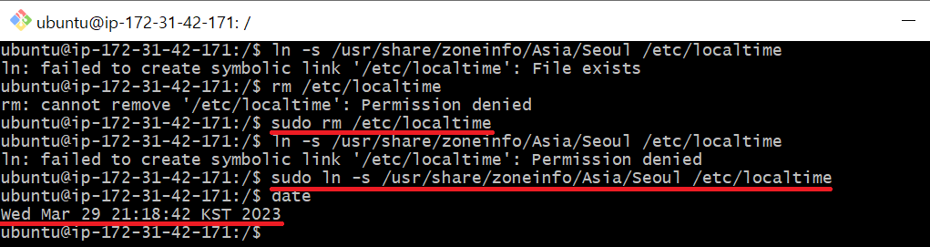 EC2에 접속하여 'date' 라고 쳐보면 현재 시각과 맞지 않는 것을 알 수 있는데, 위 명령어를 사용하여 기존의 local time 설정을 변경해줄 수 있다.6