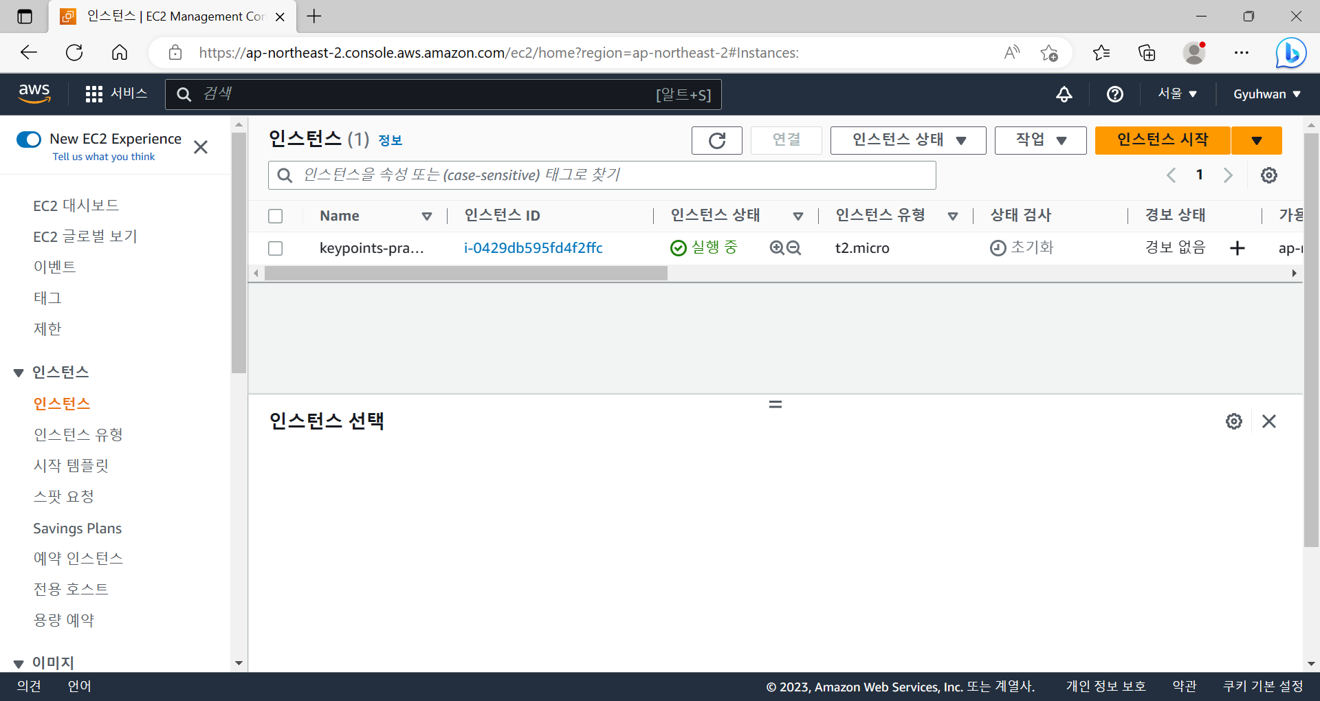 생성을 마치고 인스턴스 탭을 보면 새로 생성된 인스턴스를 확인할 수 있다.