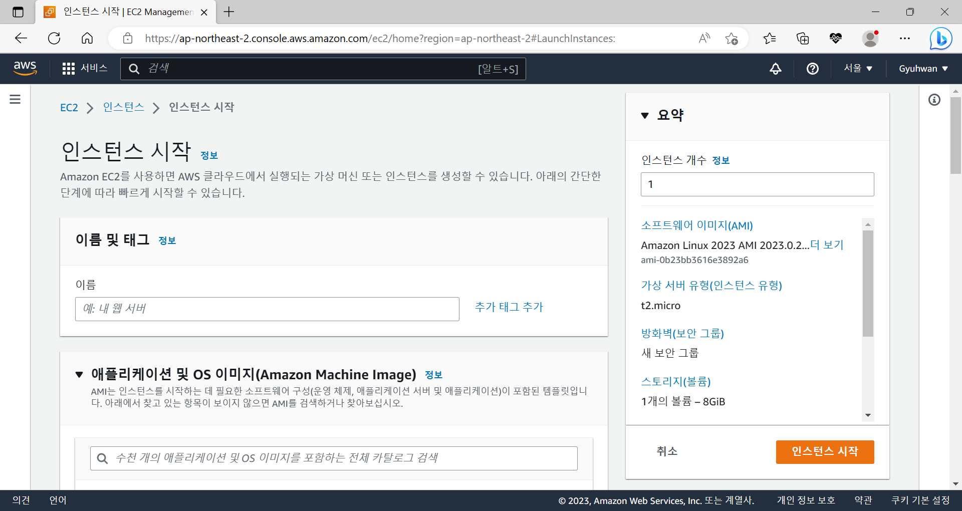 인스턴스 시작 버튼을 눌렀을 때 가장 먼저 볼 수 있는 화면이다. '이름 및 태그' 항목에 원하는 이름을 작성해준다. 이는 앞으로 생성할 인스턴스의 이름을 정해주는 것으로, 비어있어도 된다고 한다.