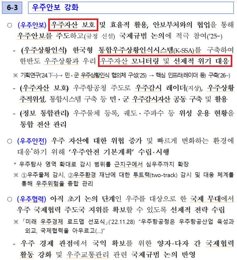 안보 관련하여 우주항공의 4대 기술 분야로는 선택되지 않았으나, 그 우주항공 분야의 기반이 되는 것들 중에는 '우주안보'와 '국제 협력'이 있다. 우리나라보다 앞선 미국은 이미 우주로 뛰어든 지 70여년에 이른다. 그 사이에 서로 기술을 공유하는 등의 협력으로 실제 시간적 차이가 70여년에 이르는 것은 아니지만, 당시 미국이 위성과 발사체에만 집중했다고 하더라도 지금 시작하는 셈인 우리는 그것들의 정상 운영을 위해서도 보안에도 함께 집중해야 한다고 생각한다. 우주항공청의 추진 전략에 이들이 포함된 것으로도 우주 보안 분야에 대한 흥미가 커지고 더 빨리 연구해보고 싶다는 생각이 든다.