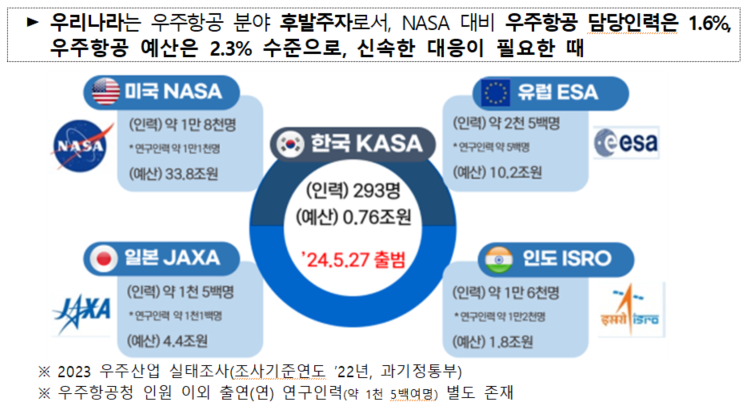 우리나라는 우주항공 분야의 후발주자로, NASA 대비 인력과 예산이 부족하다는 언급이 있다. 관련 언급과 함께 첨부한 위 이미지의 내용을 기준으로 한다면 예산과 인력이 가장 적은 인도의 ISRO에 비해서 연구 인력은 대략 10%를 조금 넘으며 예산은 50%에 조금 못 미친다. 일본의 JAXA와 연구 인력을 비교한다면 조금 더 많은 편이라고도 할 수 있으나, 예산 면에서는 많이 부족한 실정인 것 같다. 우주항공청 이외의 연구인력이 별도 존재 표길 보아 별도의 출연 연구기관에서의 예산은 포함하지 않은 것이라고도 본다면 예산은 조금 더 있을 수 있겠다. NASA와 비교해서 그렇지 나머지 JAXA의 창립은 2003년, ESA의 창립은 1975년, ISRO의 창립은 1969년인 것에 비하여 KASA는 올해 2024년에 출범했기 때문에 이해되지 않는 부분은 아니다. 하지만 우주항공 분야에서 획기적인 발전을 이룩하고자 한다면 더 많은 예산이 필요한 것은 사실이다.