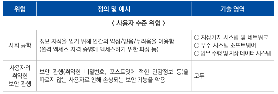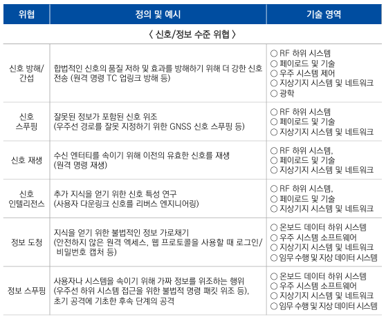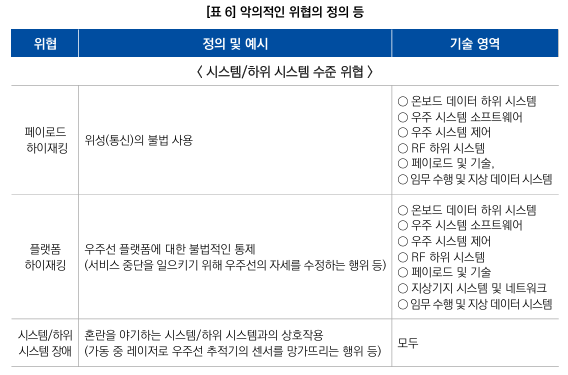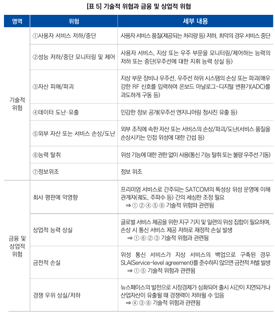 또한 KISA Insight의 표4와 같이 우주전략을 발표했으며, 저궤도 위성통신에 대한 사이버 보안 평가 보고서에서 표5와 같은 기술적 상업적 위협에 대한 내용을 분류했다.