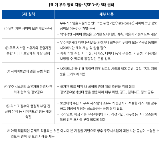 미국에서는 2017년 12월, 국가안보전략에서 사이버 사고 및 무선 주파수 위협에 대한 탄력적인 대응의 필요성을 제시한다. 이를 시작으로 2020년 9월에는 최초의 종합 우주 시스템 사이버보안 정책이라고 할 수 있는 우주정책지침-5 (Space Policy Directive-5)를 제시했는데, 이는 우주산업 전반에 대한 사이버 보안 강조를 내용으로 하고 있다. 여기에서는 기존에 지상 시스템에 적용되었던 사이버보안 전략을 우주 자산에도 적용한 것으로, 보안과 경제적 번영, 과학적 지식을 보호하는 것에 초점을 두었다. 특히 상업적 목적의 위성의 수가 늘어나는 것에서 민간 기업과의 협력을 강조하고 있다.