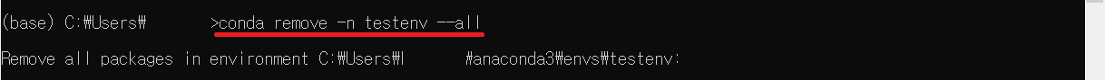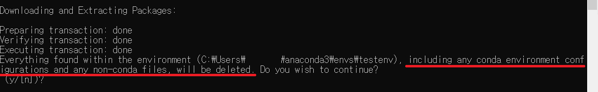 제거 과정에서 포함된 conda 환경 설정 및 non-conda 파일을 함께 지울것이냐고 묻는데, 필요에 따라 선택함. 기본값인 'n'을 선택하는 경우에는 가상환경 이름 자체는 남게 됨.