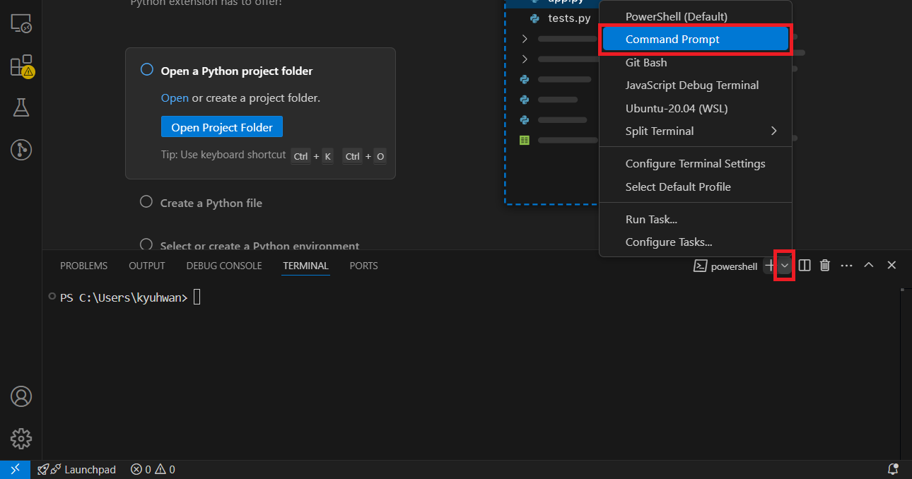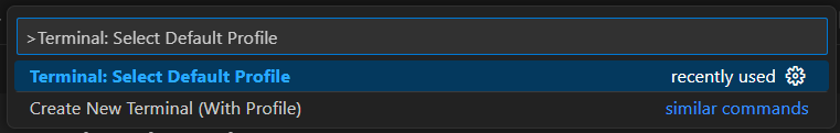 만약 terminal default를 변경하고 싶다면 상단 메뉴바 View > Command Palette 혹은 ctrl + shift + p 로 커맨드 팔레트를 열고 'Terminal: Select Default Profile' 을 입력하여 변경 가능함.