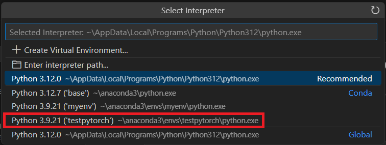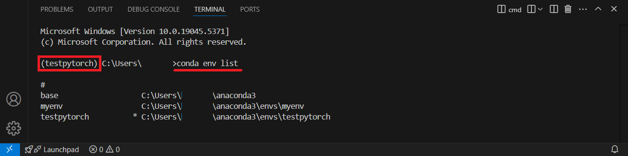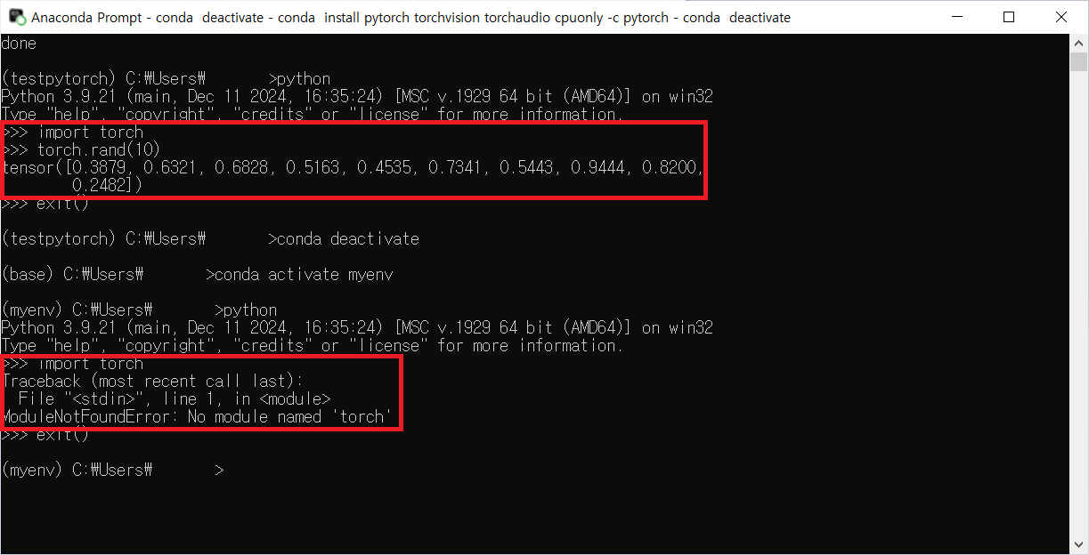 가장 간단한 방법은 python을 실행하여 torch를 import 해보는 것임. PyTorch가 설치된 가상환경에서는 온전하게 동작하지만, 그렇지 않은 가상환경에서는 동작하지 않음.