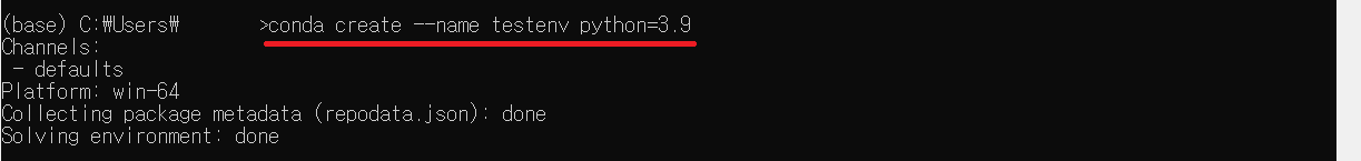 conda create 명령어로 가상환경을 생성함. --name 대신 -n으로 작성해도 됨.