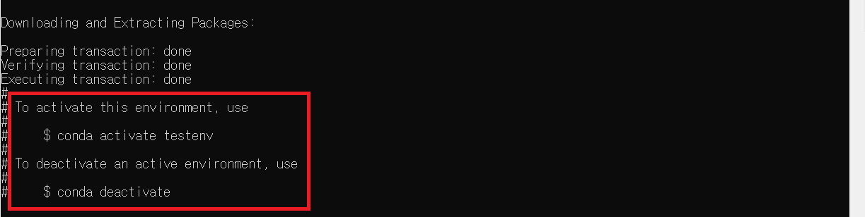 가상환경을 생성하면 마지막에 환경 활성화 / 비활성화 방법을 친절하게 출력해줌.