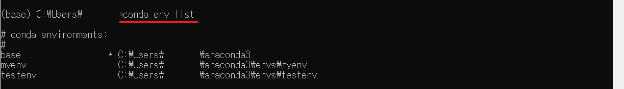 생성한 가상환경의 목록을 확인할 수 있음. 이때 목록에서 보이는 별표(*)는 현재 활성화한 가상환경을 표기함.