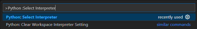 상단 메뉴바 View > Command Palette 혹은 ctrl + shift + p 로 커맨드 팔레트를 열고 'Python: Select Interpreter'를 선택하면 위 이미지에서처럼 anaconda 가상환경들의 목록이 나옴. 혹은 상단 검색창에 '>' 를 입력하고 Python을 입력해도 찾을 수 있음.