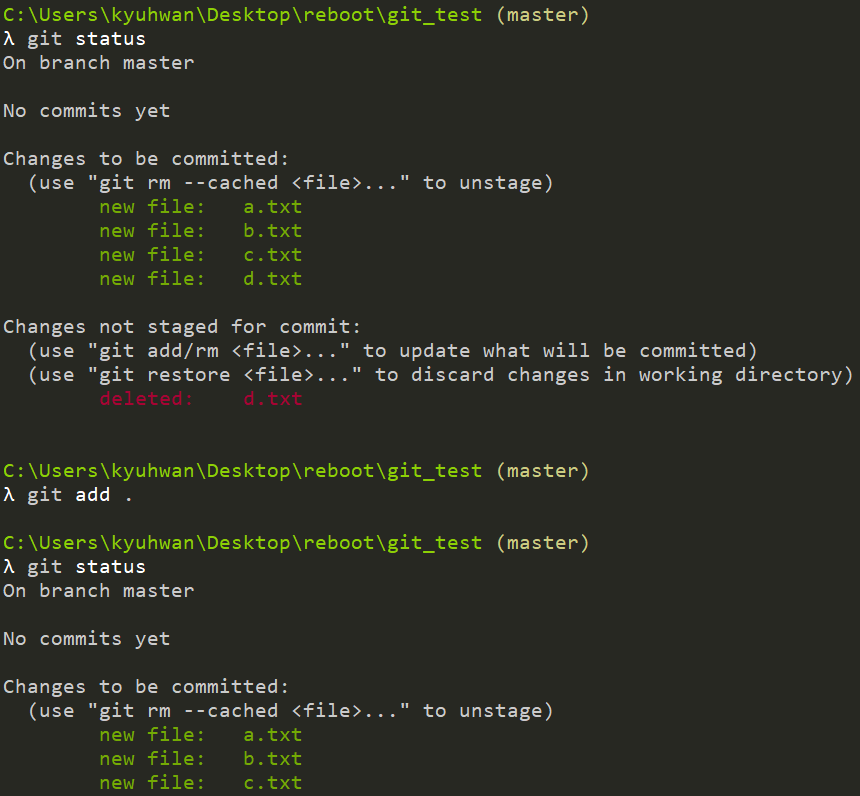 만약 세 파일을 모두 staging area로 옮겼을 때 d라는 파일이 삭제되면, working directory에 d.txt 가 삭제되었다는 메시지를 볼 수 있다. 물론 메시지가 권장하는대로 d.txt를 add 하거나 rm으로 지워주거나, restore 명령어로 stage에 올라간 d.txt를 없애도 된다. 여기서 삭제된 파일을 add하는 경우, git status를 확인해보면 삭제된 d 파일은 directory에 없었기 때문에 staging area에 추가되지 않은 것을 확인해볼 수 있다. 즉, 삭제되었지만 삭제된 파일이 존재하지 않아서 삭제된 파일의 staging이 일어나지 않는 것이다.