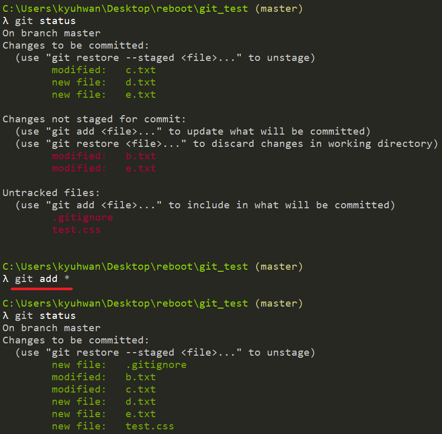 이 방법들 말고도 git add .를 작성하게 되면 현재 Git으로 관리하고 있는 모든 파일을 포함해서 staging area에 추가한다고 한다. 즉, 파일을 삭제한 내용을 add 하게되는 결과이기 때문에 해당 파일은 staging area에서 사라지게 되는 것이다. 이 git add . 은 git add * 과 같은 결과를 낸다고 생각하면 편하다.