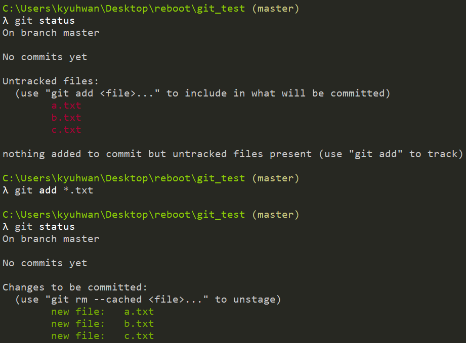 add는 추가한다는 의미의 단어로, 변경 사항들을 stage에 추가하는 명령어이다. 명령어를 사용하게 되면 아직 commit이 없으나 commit할 수 있는 변경 사항이 존재한다는 내용을 볼 수 있다. 그리고 이렇게 stage에 올라간 파일들을 commit 하게 된다. status 명령어는 바로 다음 내용으로 정리할 예정이다.