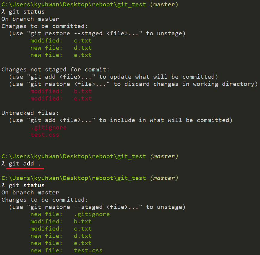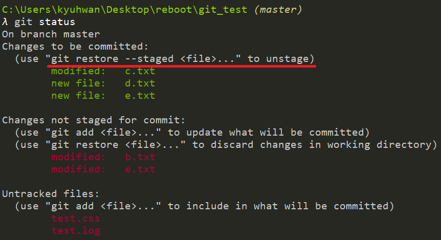 주의할 점은 이미 tracking 되고 있는 파일을 add로 추가했다가 이 명령어를 작성한다면 다시 untracking 된다는 것이다. 이런 경우 unstage 하고 싶다면 restore 명령어를 사용한다.