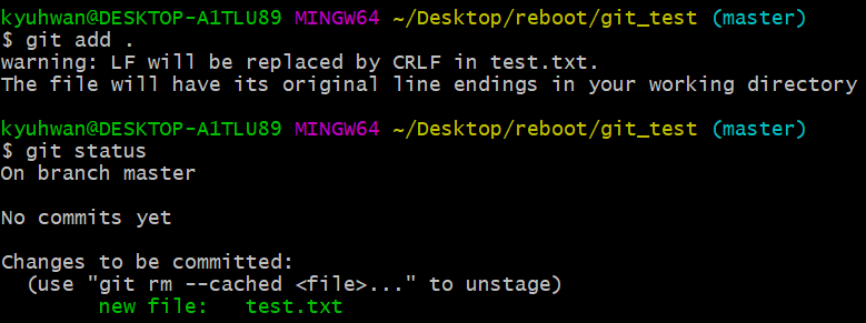 이 단계에서의 문제는 이미지 상단의 add 명령어를 사용한 직후에 등장하는 경고문구이다. 경고문의 LF와 CRLF가 무엇인지와 관련 설정, 또 이에 대한 자체적인 실험과 고찰이 있어서 가져오겠다.