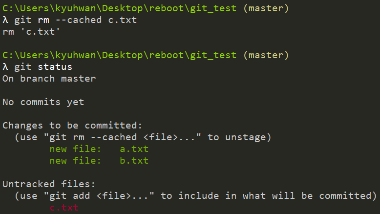 add 명령어를 사용하고 난 후 status 명령어를 이용해서 현재 상태를 확인해보면 rm 명령어를 사용해서 stage에 올라간 원하지 않는 파일을 unstage할 수 있다고 친절하게 메시지로 나타내주기 때문에 전혀 당황하지 않아도 된다. 이 명령어를 통해 원하지 않는 파일을 staging area에서 working directory로 다시 옮길 수 있다.