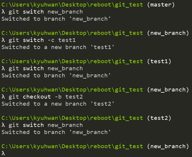 번거롭게 새로운 branch를 만들고 이동하는 것을 동시에 하고 싶다면 어떻게 할까? 이것은 switch나 checkout 명령어로 가능하다.