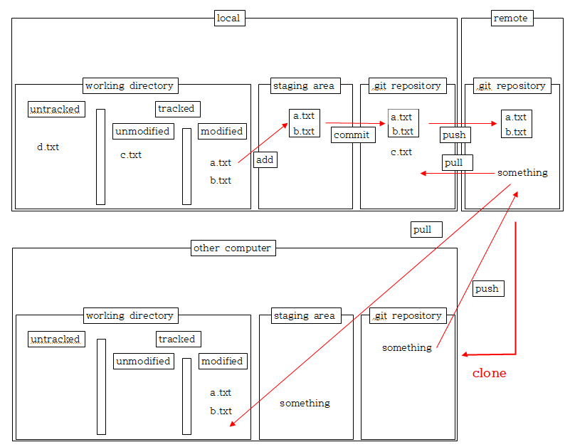 이제는 가장 처음의 Git 의 전반적인 구성에서 그렸던 그림이 변화될 시점이다. 합류하게 될 프로젝트는 어떤 remote repository에 기록되어 있을텐데, 작업할 컴퓨터에는 프로젝트에 대한 어떤 정보도 없을 것이다. 물론 개발한 내용을 올리고 merge도 해야하는 입장이기 때문에 함께 프로젝트에 참여할 수 있어야한다. 이럴 때 remote repository를 작업 컴퓨터에 clone (복사) 한다. 변경된 내용이 있다면 repository를 또다시 clone하는 것이 아니라 local로 pull 해올 수 있고, 반대로 작업한 내용을 remote repository쪽으로 push 할 수도 있다. pull은 fetch와 merge 작업을 동시에 한다고 생각하면 되는데, fetch는 업데이트 된 내용을 받아오는 작업이고 merge는 그것들을 합치는 작업이다.