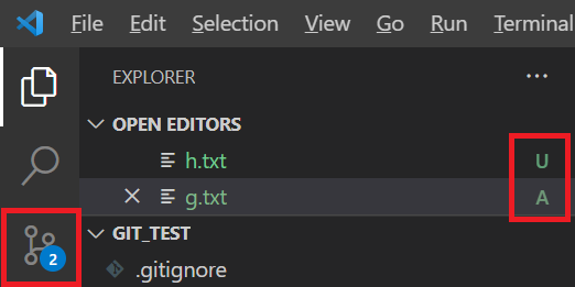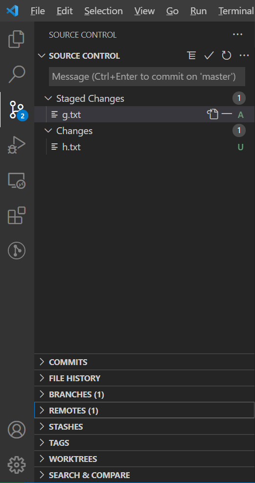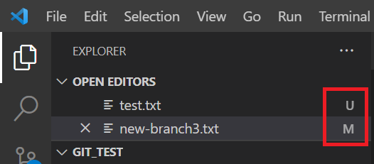 GUI로 보는 방법도 있지만 visual studio code를 사용해서도 볼 수 있다. U는 untracked file, M은 modified file, A는 added file을 의미한다. 좌측 하단의 네모 박스로 표기한 것을 누르면 아래 이미지와 같이 terminal에서 보던 staging area를 시각적으로 볼 수 있고, 하단에서 어떤 commit들이 있는지, 파일의 변경 history는 어떤지, 어떤 branch들이 있는지 등등의 내용을 확인할 수 있다.