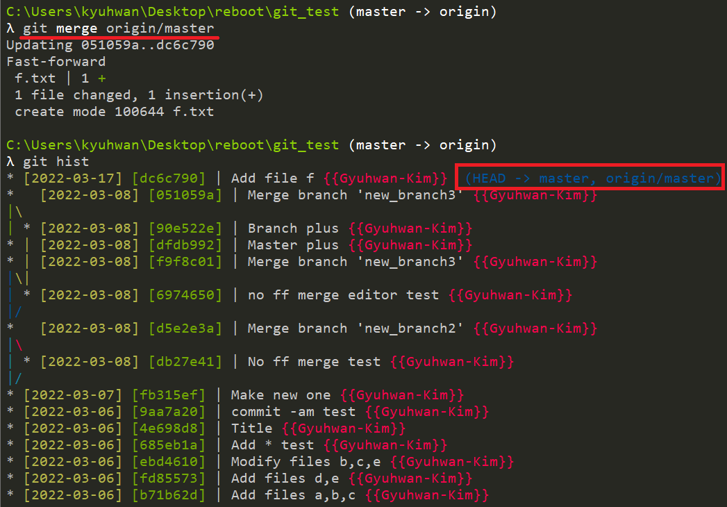 fetch 후 local의 master branch로 checkout해서 origin/master를 merge하게 되면 local과 remote의 master가 일치된 것을 history를 통해 확인할 수 있다. 그리고 이 fetch와 merge 작업을 동시에 수행하는 것이 pull이다.