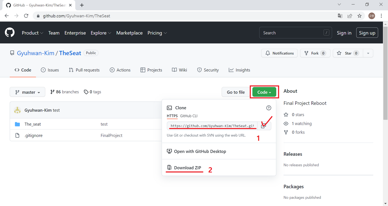 작업 컴퓨터로 clone해오는 방법은 간단하다. 우선 clone하고 싶은 repository를 github에서 찾아 들어간 후, 위 이미지와 같은 화면에서 빨간색 box로 표시된 'Code' 를 클릭한다. 첫 번째로 해당 repository의 주소를 복사해서 clone 명령어를 이용하는 방법이 있고, 두 번째로 현재 상태 그대로의 파일을 직접 다운받는 방법이 있다. 첫 번째 방법은 저장소 째로 복사되기 때문에 버전관리가 되지만, 두 번째 방법은 파일만 가져오는 것이기 때문에 따로 버전관리가 되지 않는다는 점을 기억하자.