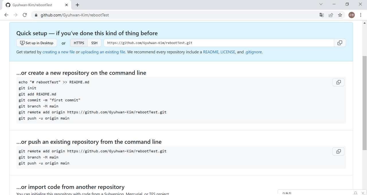 하지만 repository를 새로 만들었다면 이런 화면을 보게 된다. 권장하는대로 그대로 진행하면 된다. 중요한 부분은 code block으로 작성한 두 가지이다. 이때 'origin' 으로 표기한 곳은 저장소 master branch의 이름이니까 마음대로 하면 된다고 하며, 보통 최초이면 origin이라고 명명한다고 한다. 그리고 main과 병기한 master는 local의 branch 위치이며, origin에 main(master) branch를 올리겠다는 명령어가 push이다. 때문에 local의 branch의 이름을 명확하게 알고 작성한다.