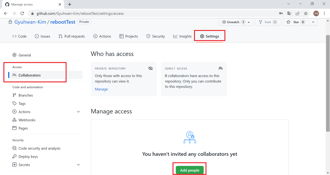 혹은 애초부터 settings > Access > Collaborators > Manage access 를 통해 작업하는 repository에 대한 접근 권한을 설정하여 함께 협업할 사람을 추가할 수도 있다.