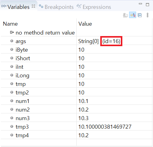double num3=10.3; // d, f 를 붙이지 않으면 double type 으로 간주 된다.