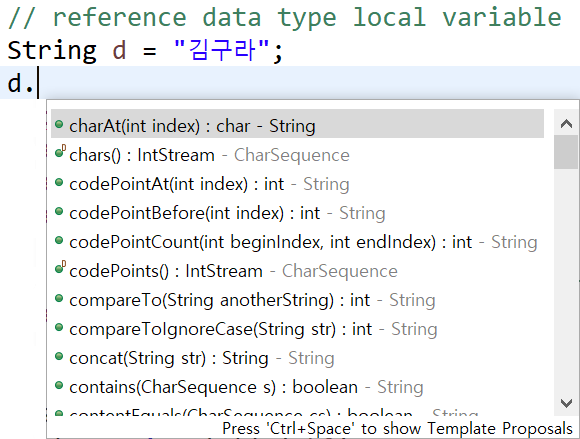 reference type data에 '.' 을 찍으면 뭔가 기능이 있는데, 이것이 큰 특징이다. 다음 이미지로 이어서 설명하겠다.