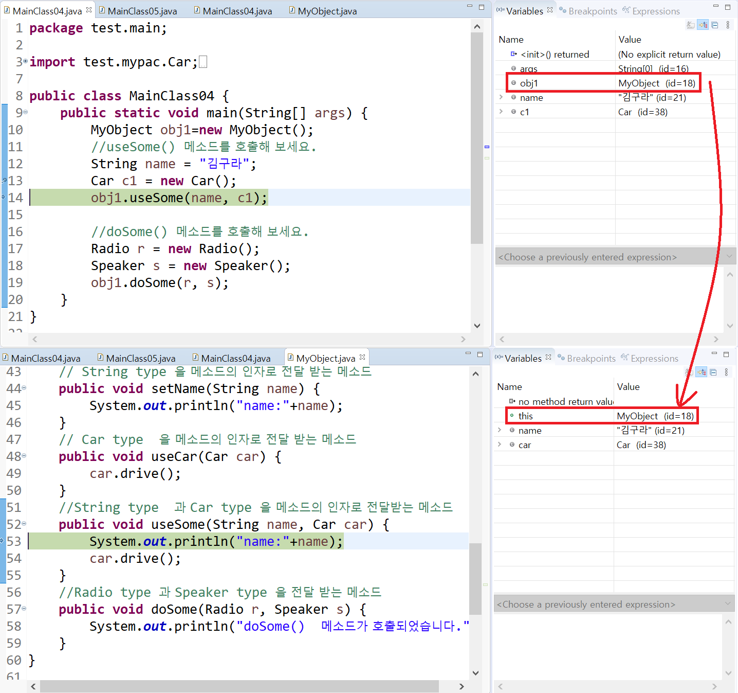 eclipse의 debugging 기능을 사용하다가 보면 표기한 'step into' 를 사용할 수 있다. 어떤 class의 method를 사용하기 위해서는 해당 class 객체의 참조값을 쓰게되는데 이때 method 위치에서 step into를 사용하면 해당 method를 추적해서 간다. 이때 local value는 만들어졌다가 사라지고, this는 해당 method가 있는 객체의 id를 받아온다.