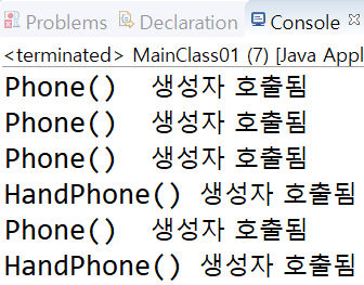 이 main method를 실행하면 왼쪽 이미지와 같은 console 창의 메시지를 얻을 수 있다. 가만 보면 신기한 것 같다. HandPhone 객체를 만들었기 때문에 constructor에 작성해둔 메시지가 출력된다는 것은 알겠는데, 부모 class인 Phone class의 constructor에 작성해준 메시지까지 함께 출력이 되고 있다. 왜 그럴까?