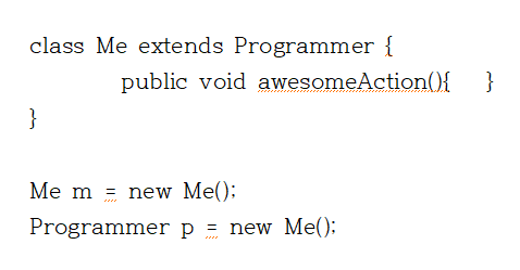 extends 는 기존 class를 확장해서 새롭게 class를 만드는 것이다. 부모 class와 자식 class 모두 type이 될 수 있다. 하지만 예시의 class를 Me type과 Programmer type으로 받는 것은 큰 차이가 있다. 확장시켜 새로 만든 class를 객체로 만들었지만, 새로 만든 method는 사용할 수 없다. 변수 앞에 선언된 type은 사용 설명서의 역할을 한다. 뭔가 객체를 만들었기 때문에 해당 method를 가지고 있는 것은 맞는데, 설명서가 구식이기 때문에 해당 method를 사용할 수 없는 것이다. 그래도 부모 class에 정의된 기능은 사용할 수 있다.